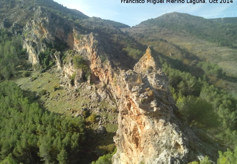 Ocultas en un paredón rocoso, ubicado en la llamada comunmente por «la Puerta de Navalcán«, que sirve de acceso a la nava fertil, regada por un manantial de agua que abastece el pueblo de Noalejo, se encuentran unas pinturas rupestres de estilo esquemático al resguardo de en un abrigo natural. Este abrigo rocoso se encuentra a una altitud sobre el nivel del mar de unos 1400 metros, situado a unos cien metros a la derecha de la carretera que conduce de Noalejo a Navalcán. Tiene unas dimensiones de 1,80 m. de altura y unos 6 m de anchura. Constituye un lugar estratégico pues desde él se avista la garganta por la que transcurre el río y da acceso a esta nava fecunda es apta para los cultivos debido a su abundancia de agua. Nos encontramos ante una representación pictórica de estilo esquemático. Son de color rojo oscuro con trazos recios, posiblemente realizados con el dedo. En el conjunto se distinguen tres grupos de figuras que Carrasco, Medina, López y Soria (1981) denominan: Grupo A, B y C. El grupo A y B parecen escenificar algún tipo de danza dirigida por un gran antropomorfo (grupo C).